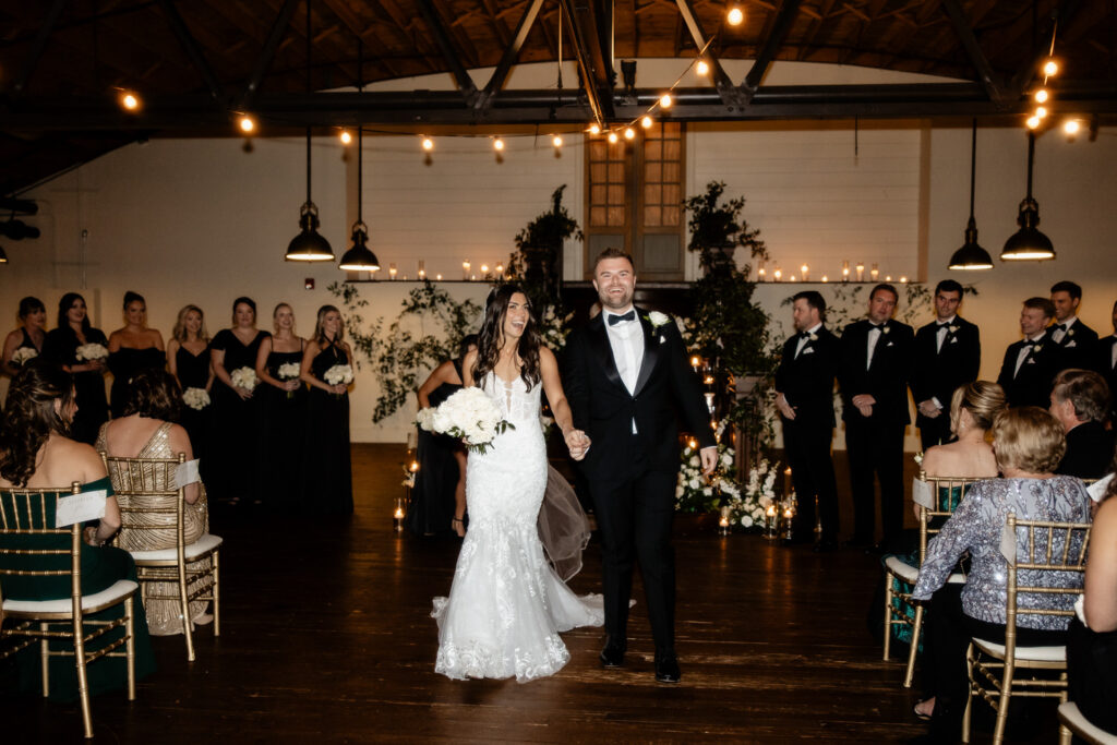 Summerour Studio’s layout makes for a seamless transition into cocktail hour. Most couples choose to host this portion of the evening in the gorgeous open-air courtyard. It’s the perfect spot for guests to mingle, enjoy passed hors d’oeuvres, and sip cocktails before transitioning into the reception space. If the weather doesn’t cooperate, the indoor foyer area also offers a beautiful backup with its high ceilings, exposed brick, and warm ambient lighting. No matter which setup you choose, the space photographs beautifully and keeps the flow of your day smooth and relaxed.