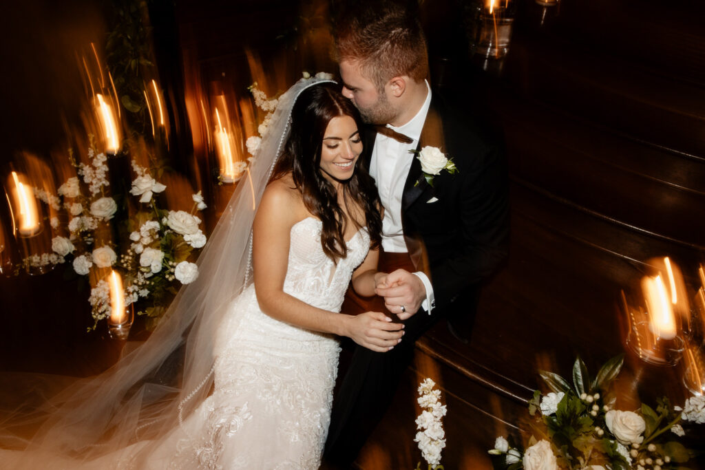 We adore the combination of the greenery-covered staircase, candles, and string lights for ceremonies at Summerour Studio!