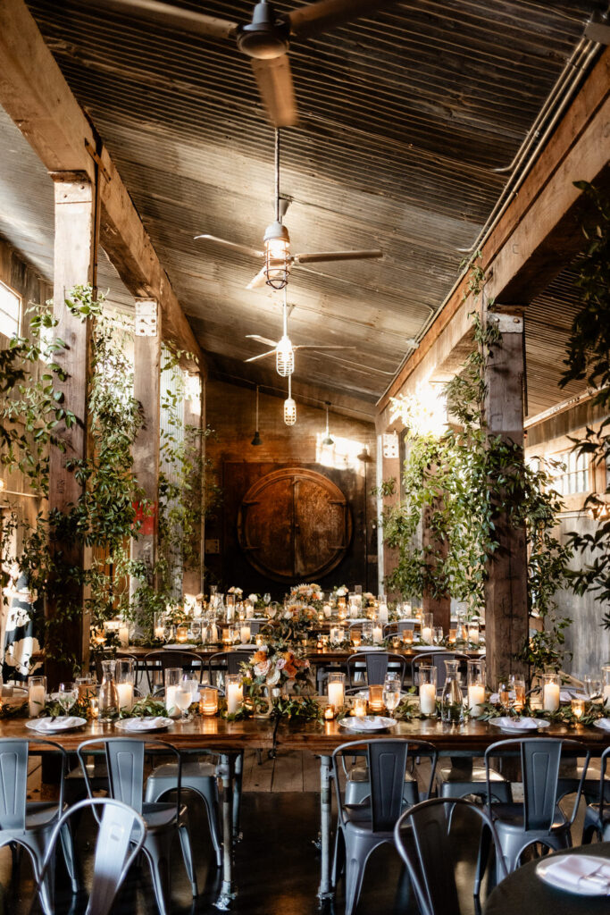 Antique tin-clad walls, massive 24-foot heart pine beams, and hand-hewn wood floors salvaged from old Georgia chicken houses set the tone. At the center of it all is a striking boiler door from the historic Arnco Newnan Textile Mill. Long handcrafted wood and steel tables create a warm, communal feel, while hidden prep kitchens let your caterers work behind the scenes to serve up incredible dishes without interrupting the flow of your celebration.