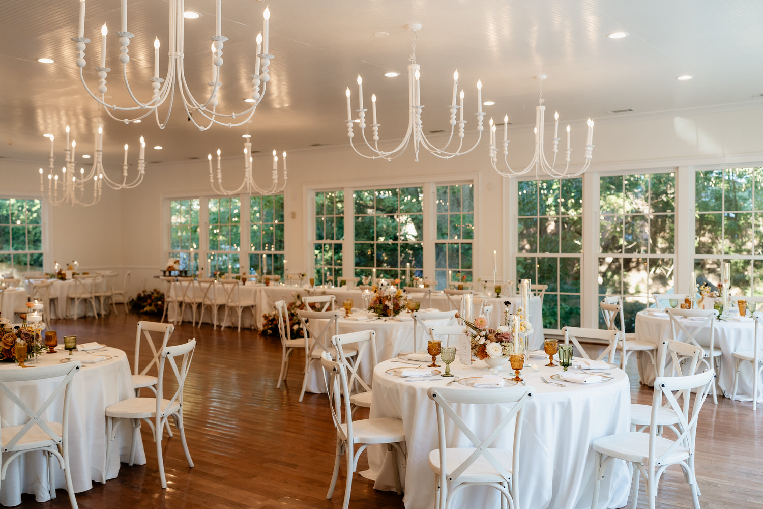 Inside, the grand ballroom enchants with its soaring ceilings, polished hardwood floors, and sparkling chandeliers, providing an exquisite backdrop for wedding ceremonies and receptions alike.