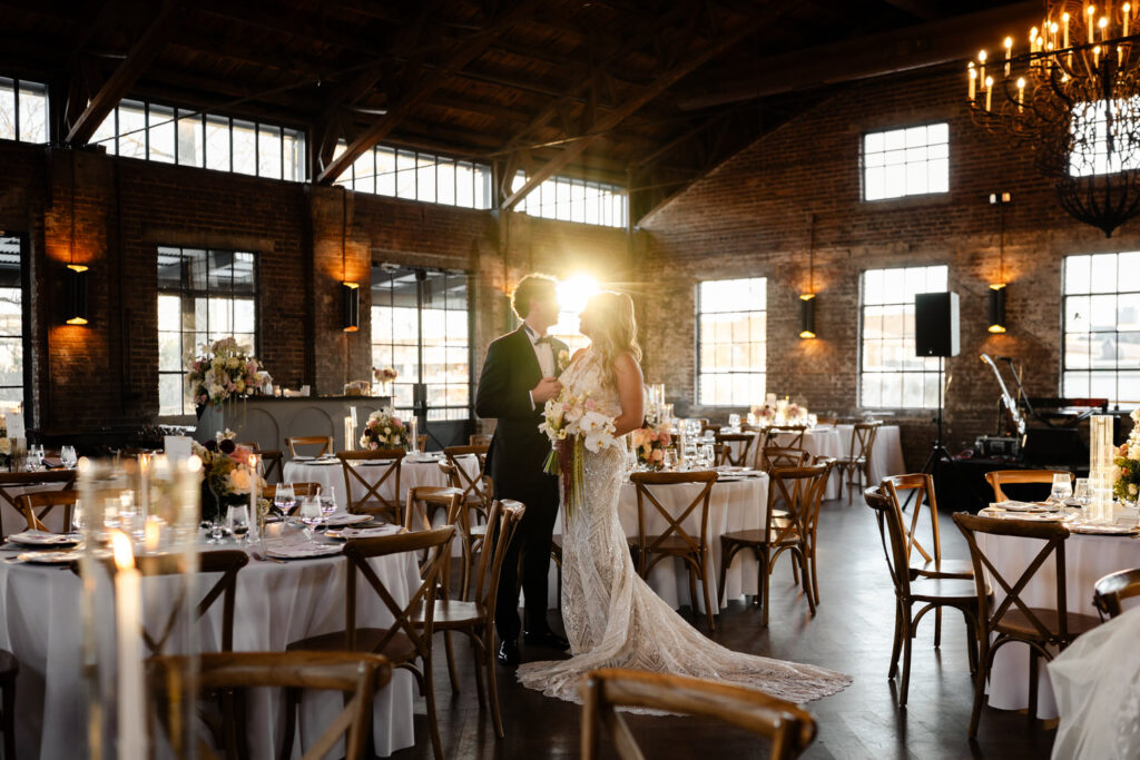 The reception space at Bishop Station is open, modern, and super customizable. Most couples keep everything in one room—ceremony, cocktail hour, and dinner—but it’s easy to flip the space between each part of the day.