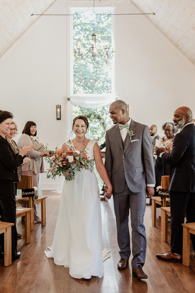 Olivia & Sekou chose to have a Juliette Chapel wedding because of the venue’s location in Dahlonega in the North Georgia mountains, as well as the quaint chapel and reception space. Their décor was inspired by the chapel and the colors of the early signs of fall in the mountains. They chose sage green/terra-cotta as their main colors with maroon and peach as accents for their Juliette Chapel wedding.