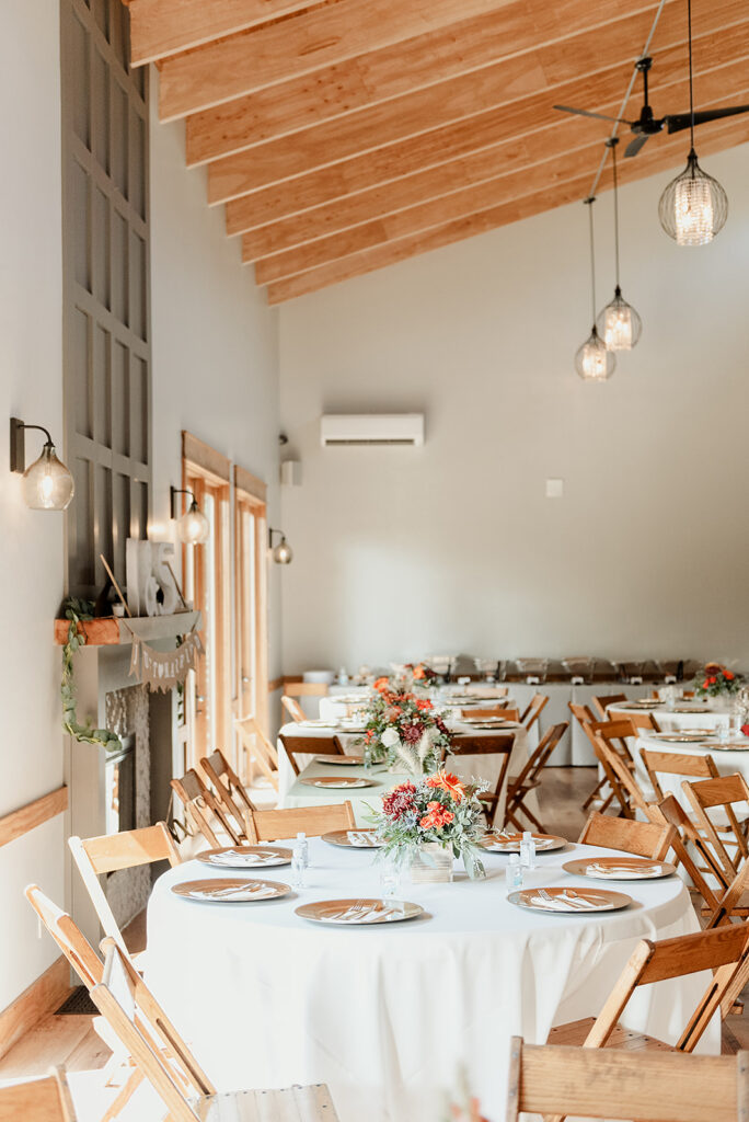 Just steps from the chapel, this cozy reception hall features a rectangular layout, hardwood floors, a fireplace, floor-to-ceiling French doors, a catering kitchen, restroom facilities, and a bridal suite. It comfortably seats up to 70 guests inside, with potential for outdoor reception under a tent if more space is needed
